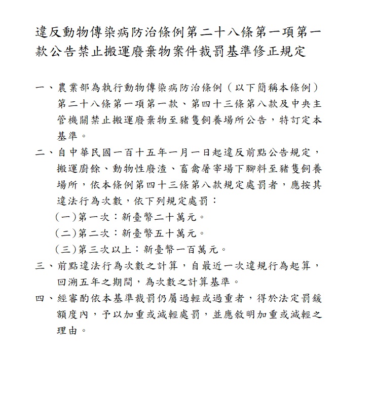 農業部令:修正「違反動物傳染病防治條例第二十八條第一項第一款公告禁止搬運廢棄物案件裁罰基準」,並自中華民國一百十五年一月一日生效。