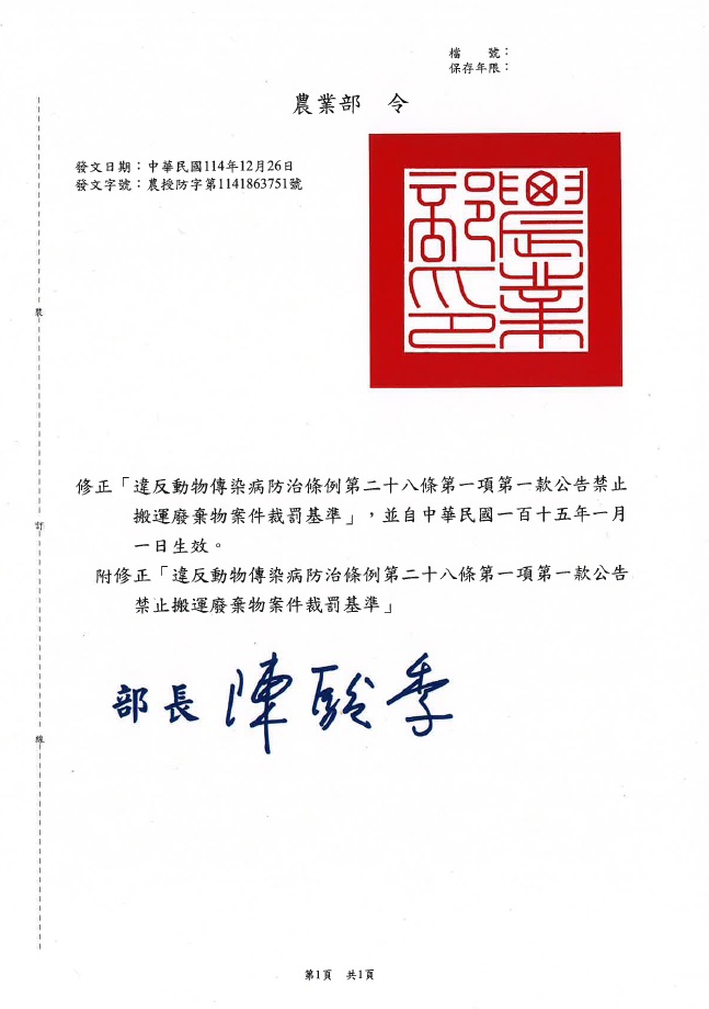 農業部令:修正「違反動物傳染病防治條例第二十八條第一項第一款公告禁止搬運廢棄物案件裁罰基準」,並自中華民國一百十五年一月一日生效。